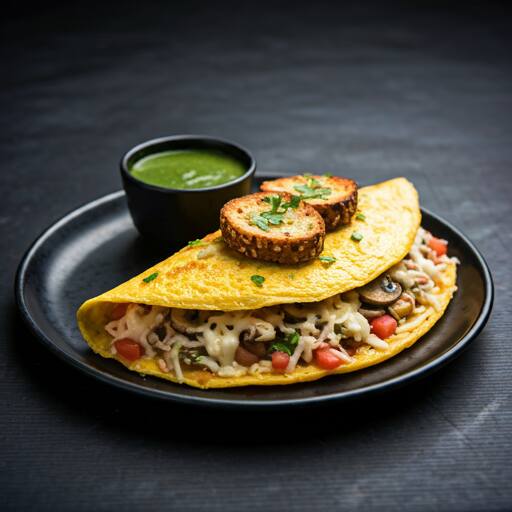 Raw eggs fried with mushroom in Amul butter served with fried chopped onion, tomato, ginger and green chili and garnished with boiled egg, cilantro and spices with bread [2 slices].