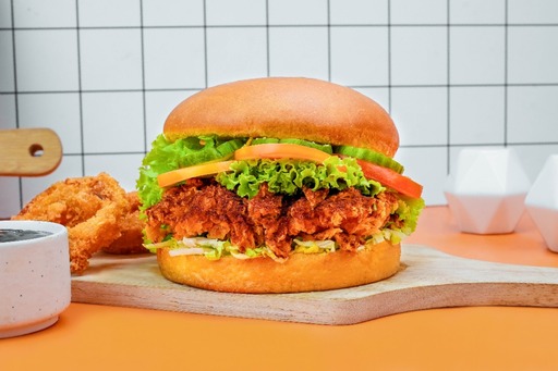 Grilled chicken fillet patty (140gm), cheddar cheese slice, iceberg lettuce, sliced tomato, jalapeno, sauteed onion, breaded onion rings , BBQ sauce, Peri-Peri sauce, butter buns. Use 100% real antibiotic free chicken
