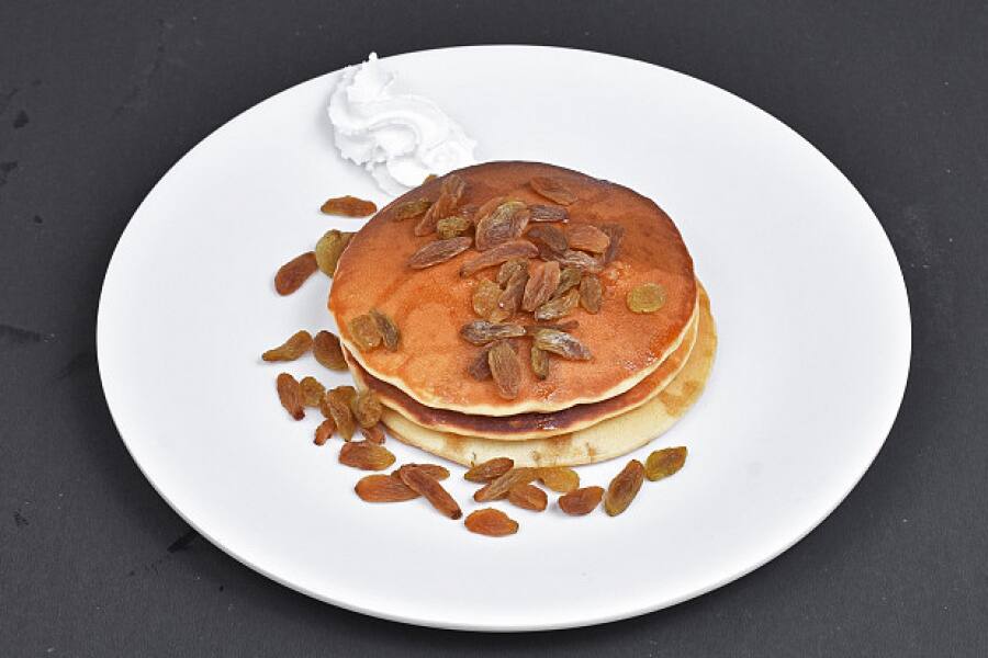 Featuring fluffy pancakes infused with warm cinnamon and studded with plump raisins,Served with Premium Pancake syrup and whipped cream