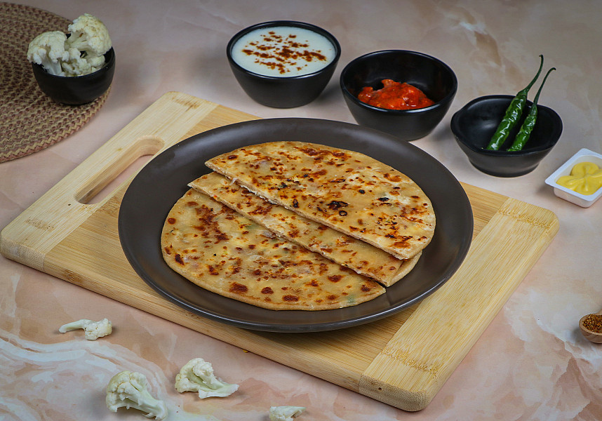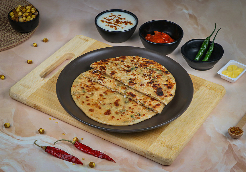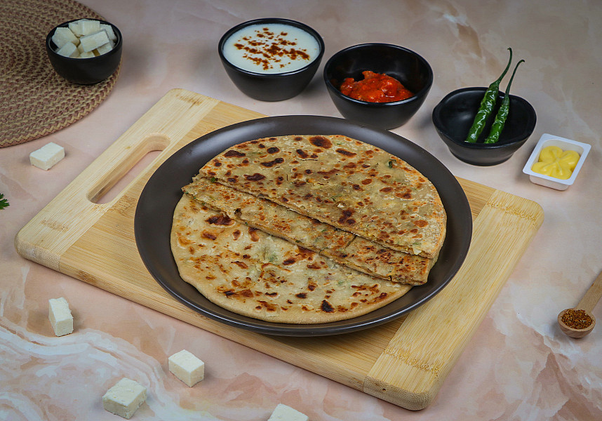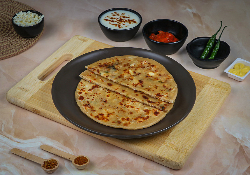Aloo Paratha is the most favored paratha. Ingredients used Wheat atta, paneer, onion and spices. Serves 1; Served with Black Chana Masala, curd, and pickle.