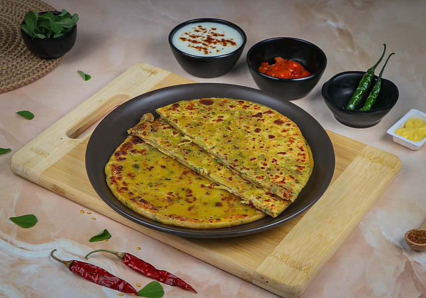 A corny twist to the traditional aloo paratha. A combination of sweetness of corn, earthiness of Aloo and spices makes a perfect meal. Served with curd, pickle and sabji. Refined sunflower oil used for cooking parathas.