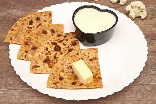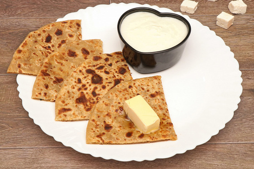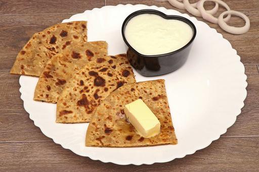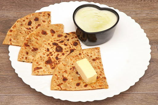 Whole wheat paratha served with curd. No colours, flavours, preservatives or chemicals used. All items cooked in pure butter and sunflower oil only.