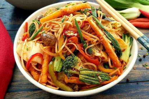 "Savor the five spice flavors of the orient with our Lucky 5 Noodles Bowl. Packed with savory mushrooms, tender bok choy, crisp broccoli, and crunchy cabbage, all served over a bed of hearty noodles, and finished with a drizzle of sprinkle of fresh spring onions."