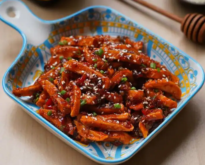 Popular Indo-Chinese dish known for its sweet, spicy, and tangy flavor profile It features crispy potato fingers tossed in a delicious honey-chilli sauce