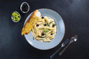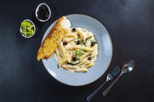 Creamy and dreamy penne or fusilli pasta coated in a luscious pan sauce made with butter and parmigiano-reggiano cheese, combined with fresh vegetables.