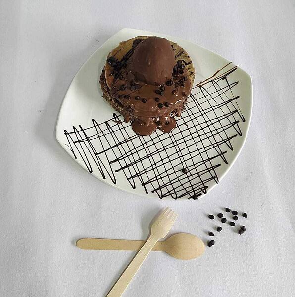 Chocolate pancakes, grilled banana, walnuts, chocolate sauce with chocolate ice cream