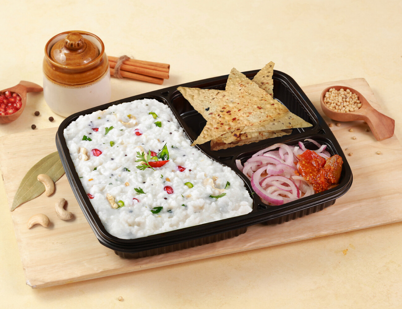 [Meal for 1] Served with Papad, Pickle & Onions. Freshly made curd rice with a tadka, crunchy roasted cashews & pomegranate.