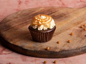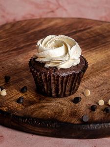 Our fluffy vanilla lite-buttercream frosting is piped to look like a dainty white rose, perched against the dark chocolate cupcake.