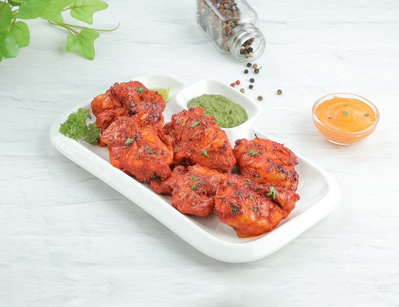 Tender & juicy boneless chicken chunks marinated in peri peri sauce & grilled in a tandoor. Drooling already? Order it!