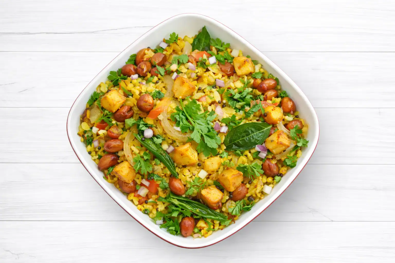 Bataka poha. A Gujarati style favorite where soft, cubed potatoes are sautéed with turmeric and mustard seeds before being folded into airy poha. It’s a heartier, comforting version that offers a delicious textural contrast between the tender potatoes and the light rice flakes.