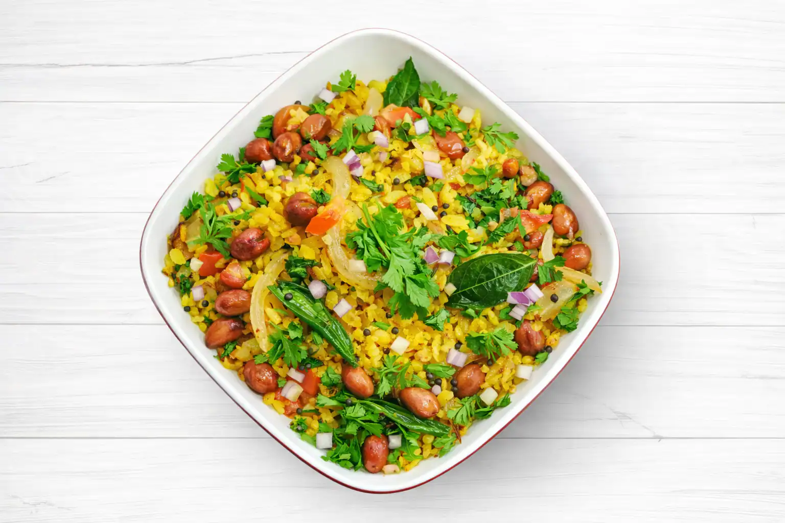 [Veg preparation] A Maharashtrian street side classic featuring fluffy flattened rice tossed with a generous helping of caramelized onion and crunchy peanuts. Every bite is a sweet and savory symphony, topped with fresh coriander and a signature lemon squeeze.