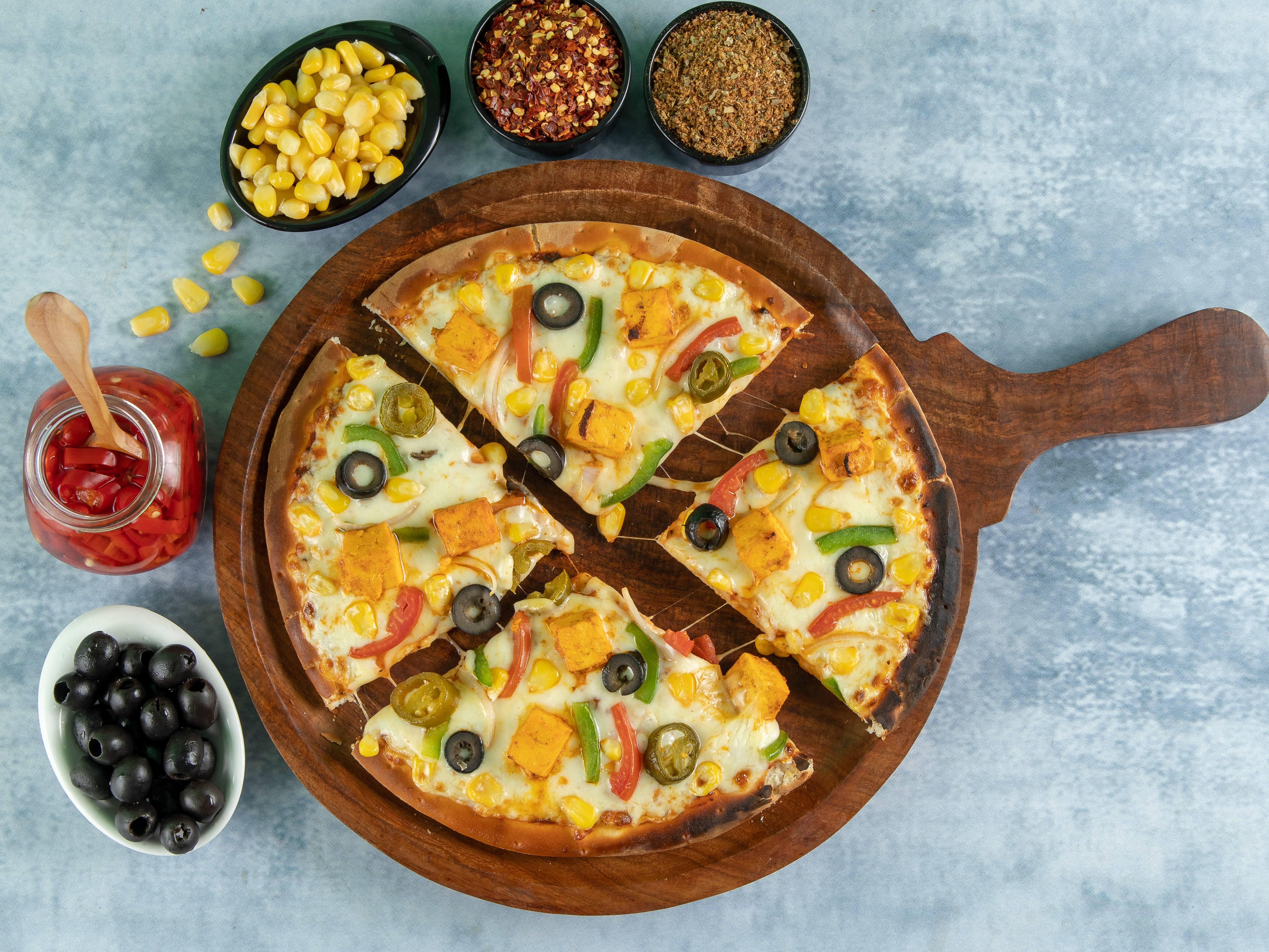 Onion, capsicum, exotica paneer, grilled mushroom, black olives, red paprika and mozzarella cheese.
