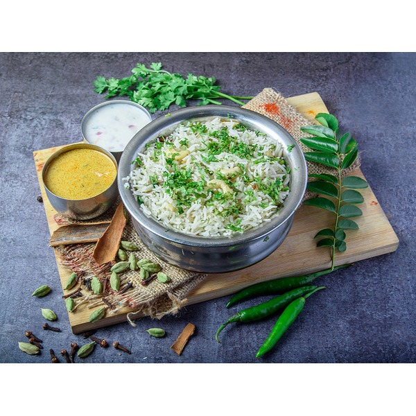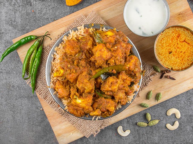 Basmati Rice cooked with Cube paneer Pieces, dum cooked and topped up with fried onions.