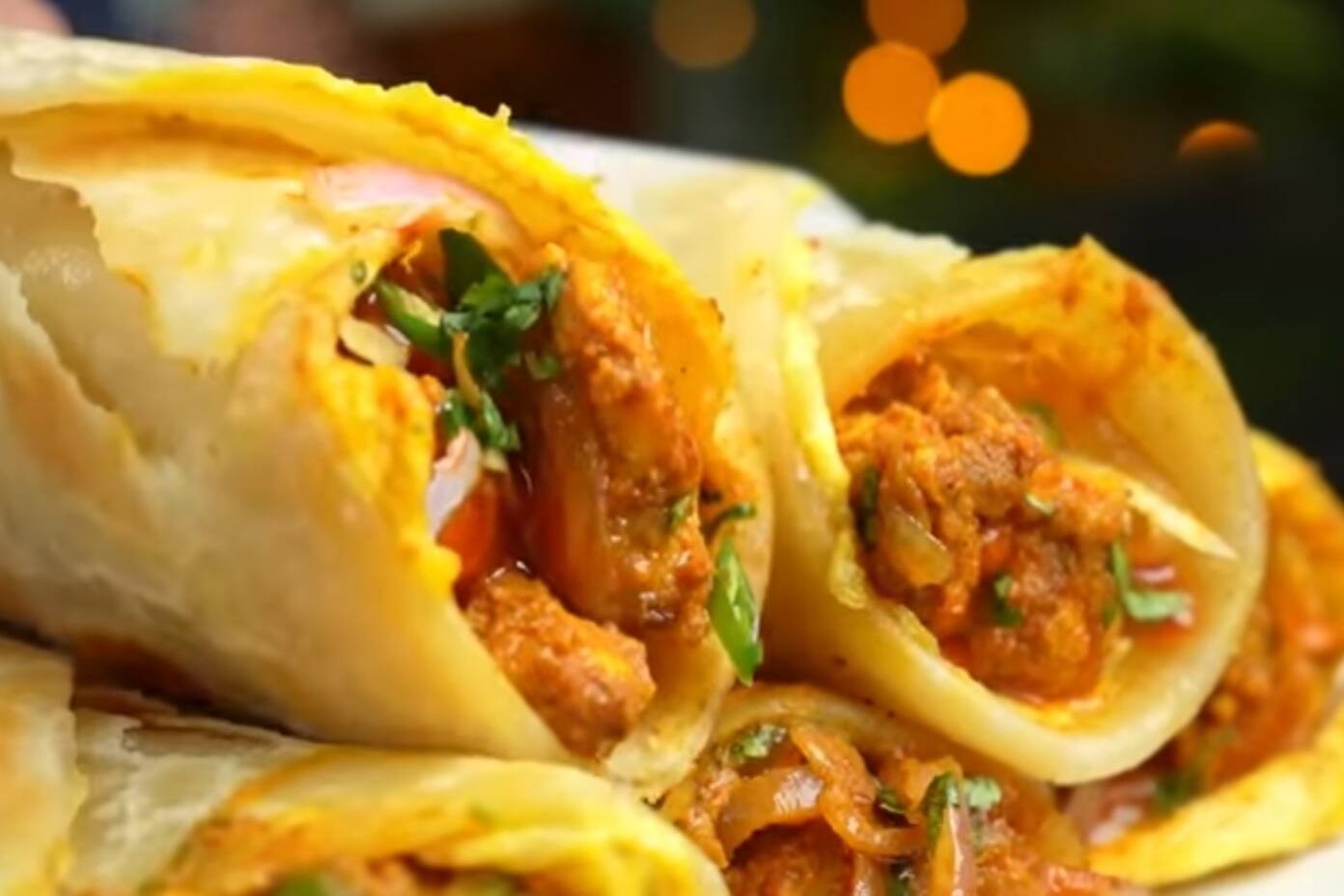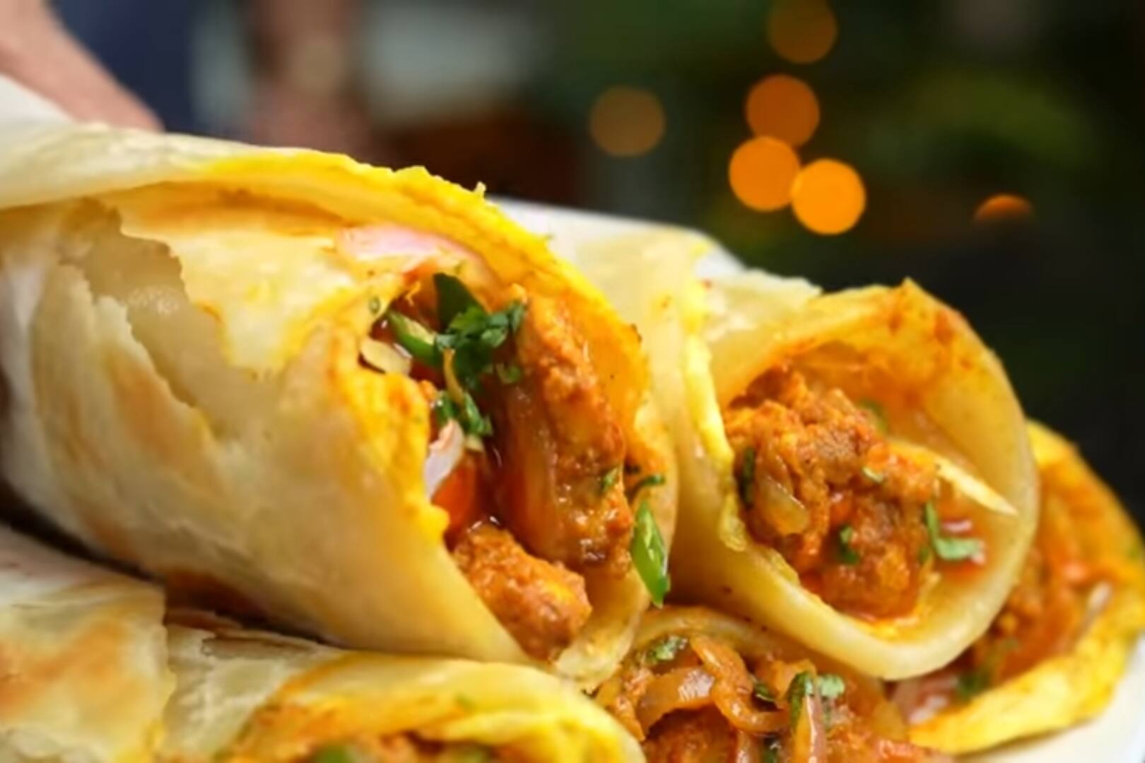 A delicious street food classic filled with double egg omelette and fried tender chicken, fresh vegetables like onion and bell peppers, and a tangy sauce, all wrapped in a soft and warm flatbread for a flavorful handheld delight.