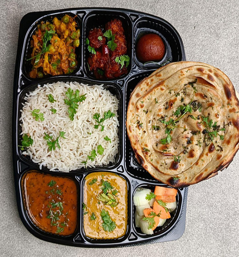 Roti/Naan (2pcs) + Pulao/ Rice + Dry Veg Curry + Veg Semi Gravy + Paneer Gravy + Dal Curry + Salad/Raitha
