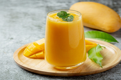 Refreshing lassi blended with ripe mangoes, creating a sweet and tangy summer delight.
