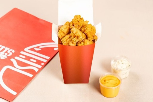 Boneless bite size crispy chicken with spice rub. Add a dip of your choice