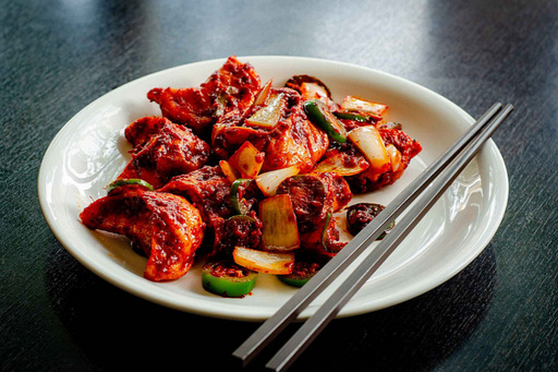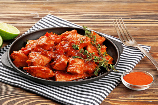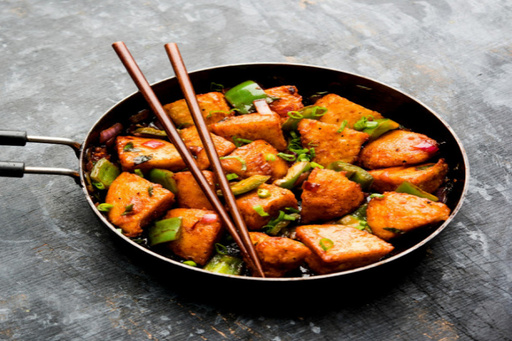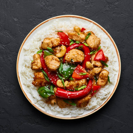 Juicy chunks of chicken tossed in the wok with spicy chili sauce and fresh vegetables.