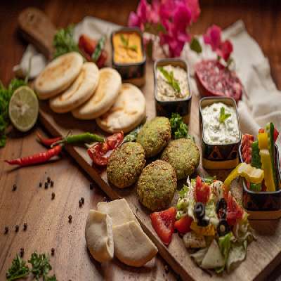 In house pita, falafel, chickpea hummus, muhammara, baba ganush, in house salad, tzatziki, lavaash sticks and pickled veggies