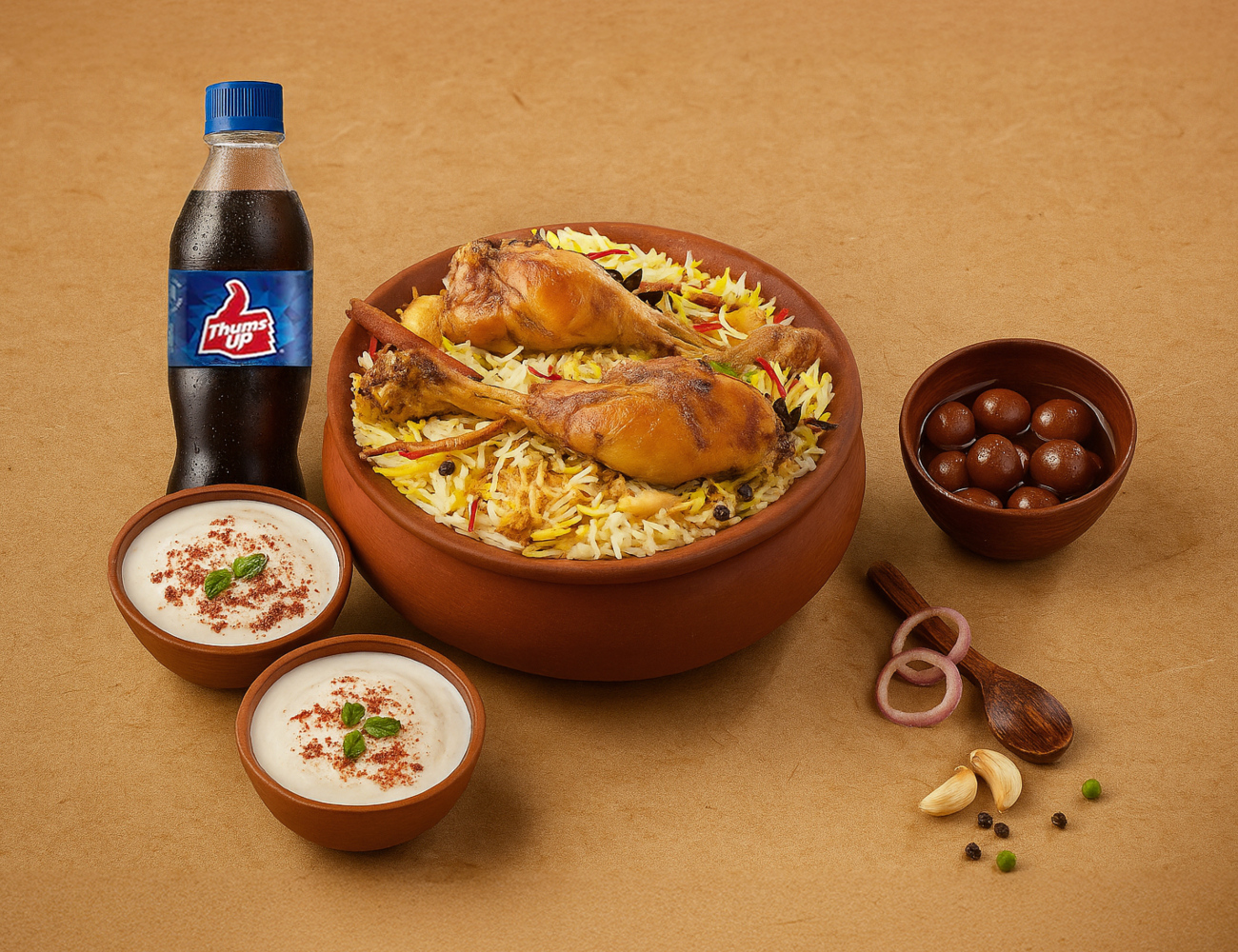 1 KG Tandoori Chicken Matka Biryani + Dessert + Thums Up