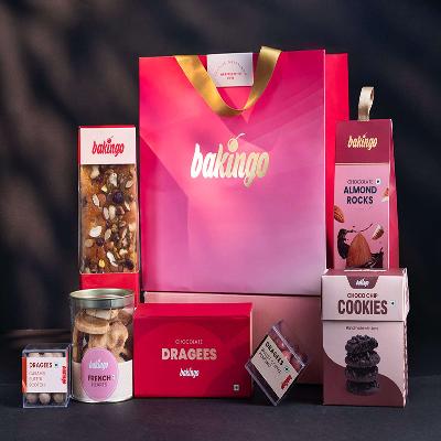 Introducing Bakingo’s Treasure Hamper from the newly launched collection! The assortment selection includes rich Almond Rocks Chocolate (100g), savory Lavash (160g), delicate French Hearts (150g), and a trio of cookies—Jeera Cookie (150g), Choco Chip Cookie (150g), and Coconut Cookies (150g).