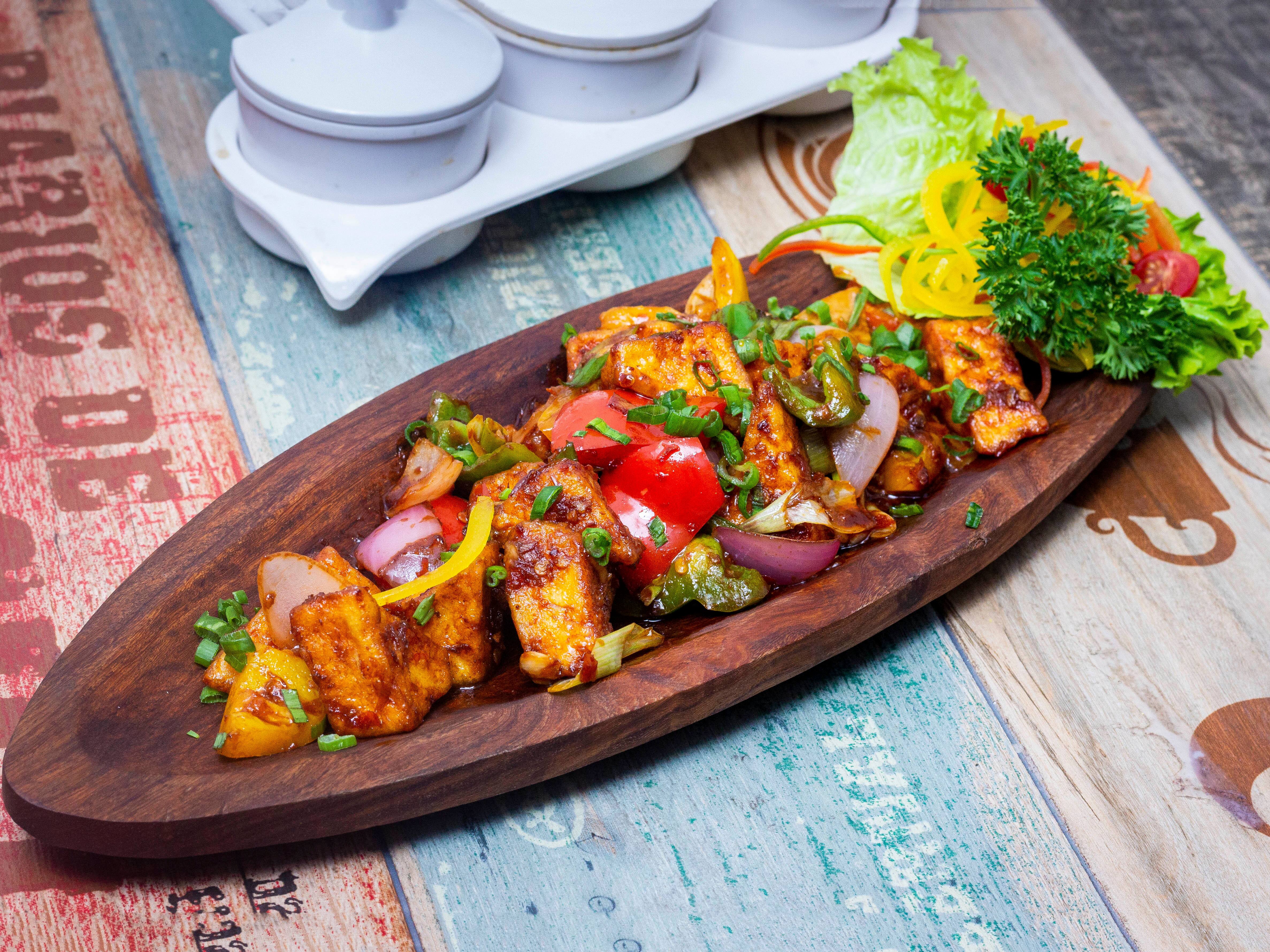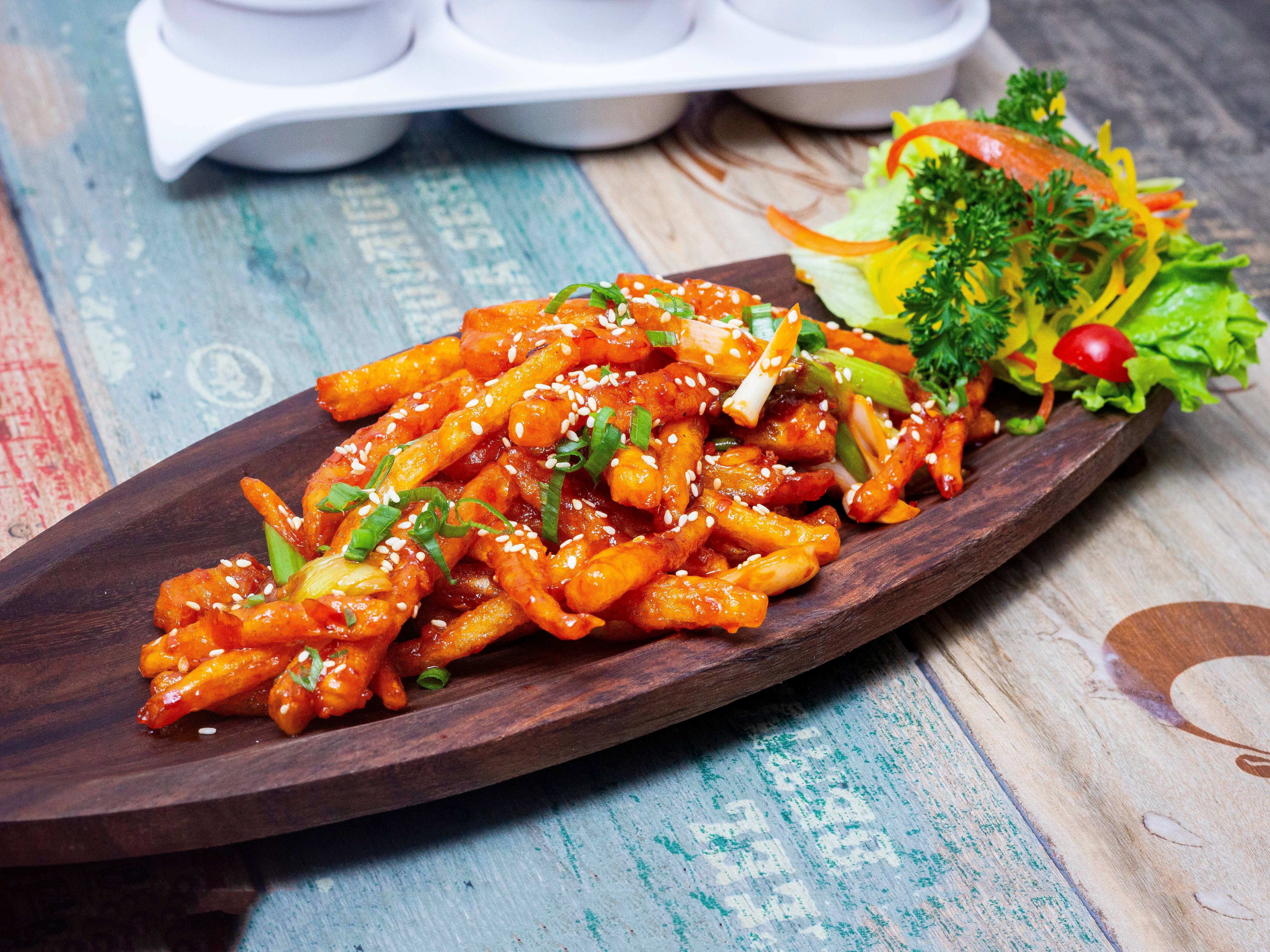 Chicken Salt And Pepper Crispy fried chicken chunks tossed with Salt & pepper ₹289 Chilli Chicken Dry Crispy fried chicken chunks tossed in spicy chinese sauces. ₹289 Honey Chilli Chicken Crispy fried chicken chunks tossed in sweet & spicy chinese sauces. ₹289 Chicken Manchurian Dry Crispy fried chicken chunks tossed in classic chinese sauces. ₹289 Chilli Paneer Dry Crispy fried paneer chunks tossed in spicy chinese sauces. ₹279 Veg Salt And Pepper Crispy fried vegetables lightly tossed with Salt and pepper ₹219 Veg Manchurian Dry Vegetable dumplings deep fried and tossed in classic chinese gravy ₹219 Crispy Fried Veggies Crispy fried vegetables lightly tossed in chinese sauces. ₹219 Honey Chilli Potato Crispy potatoes tossed in spicy honey sauce ₹199 Veg Spring Roll Chinese style vegetables stuffed in wonton sheets and deep fried to perfection. Served with sweet chilli dip. ₹219