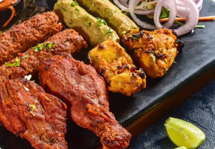 2 Pcs chicken tikka, 2 pcs malai tikka, 2 pcs tandoori chicken, 2 pcs chicken pudina, 2 pcs reshmi kabab, 2 pcs mutton seekh kabab & tandoori salad
