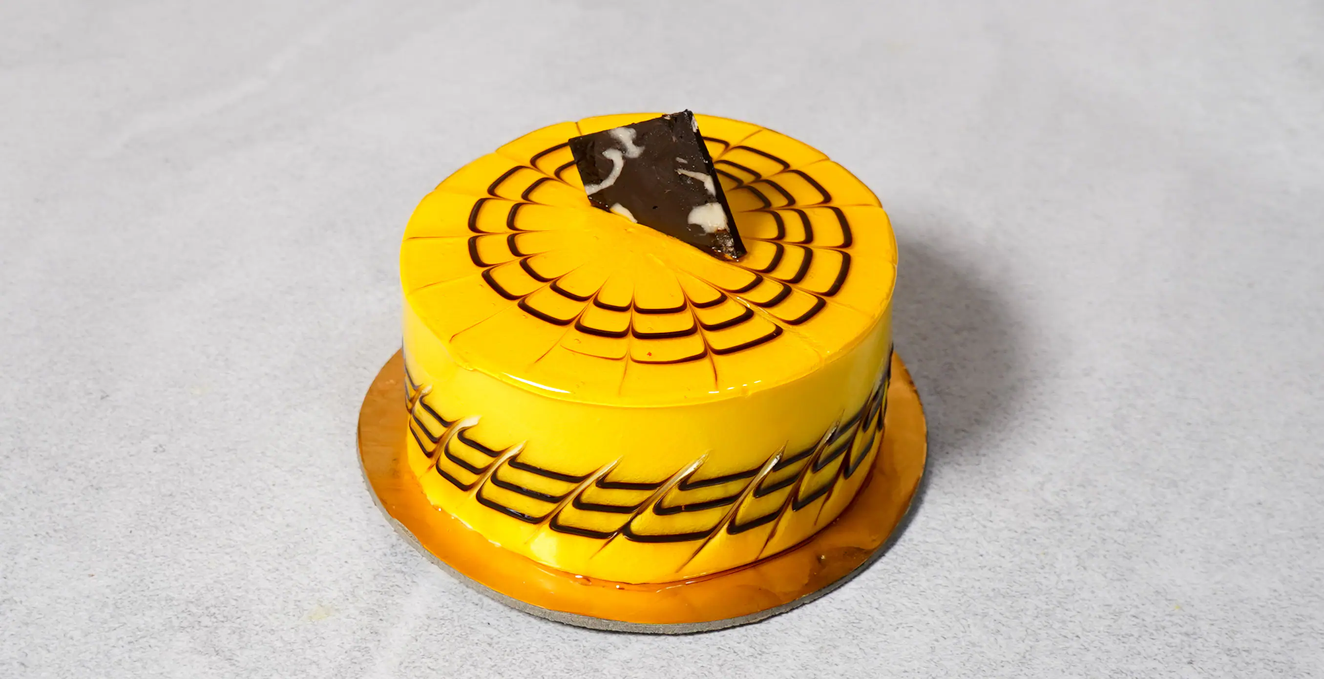 Freshly whipped vanilla cake topped with pineapples, chocolate marbles and cherries.