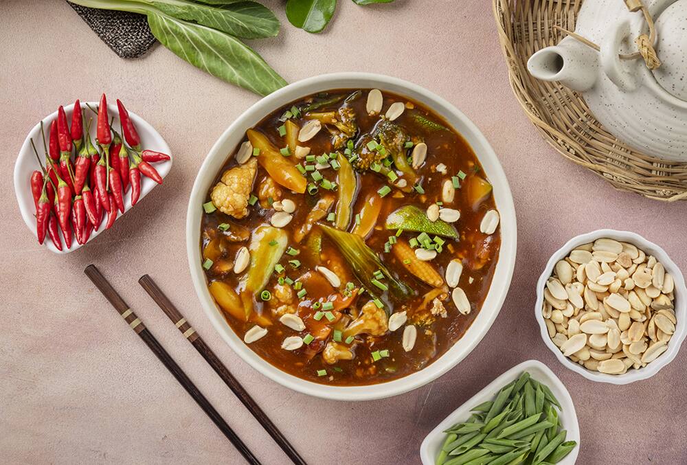 [Serves 2] Broccoli, shiitake mushroom, pok choy & bell peppers tossed with fresh red chilli topped with burnt garlic