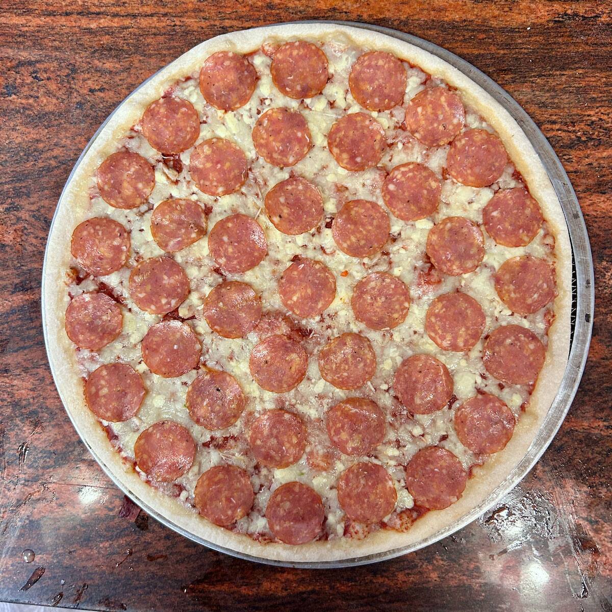 The classic margherita, white onion, garlic, mixed bell peppers, black olives, jalapenos, sun dried tomatoes and pork crisps.