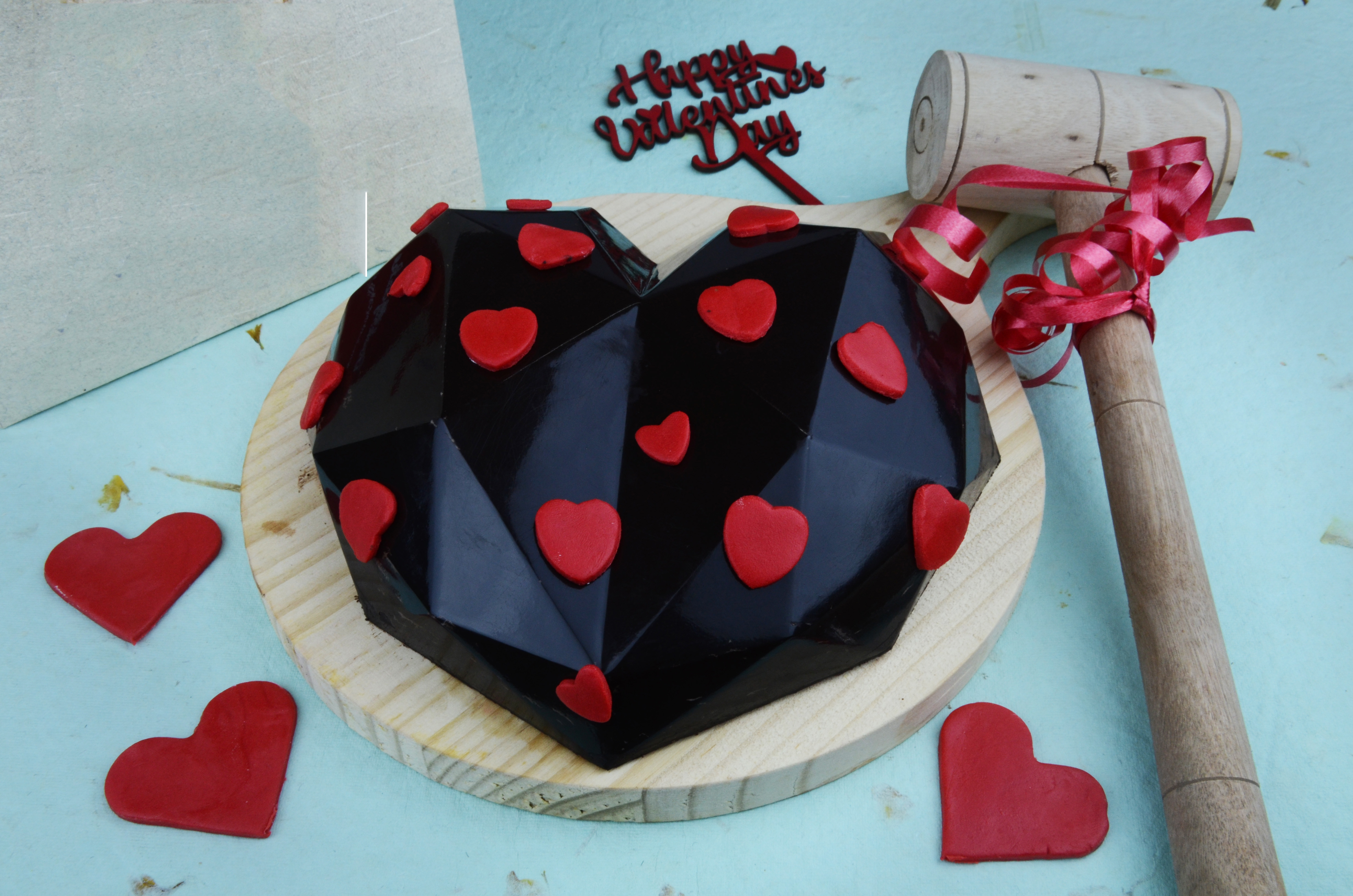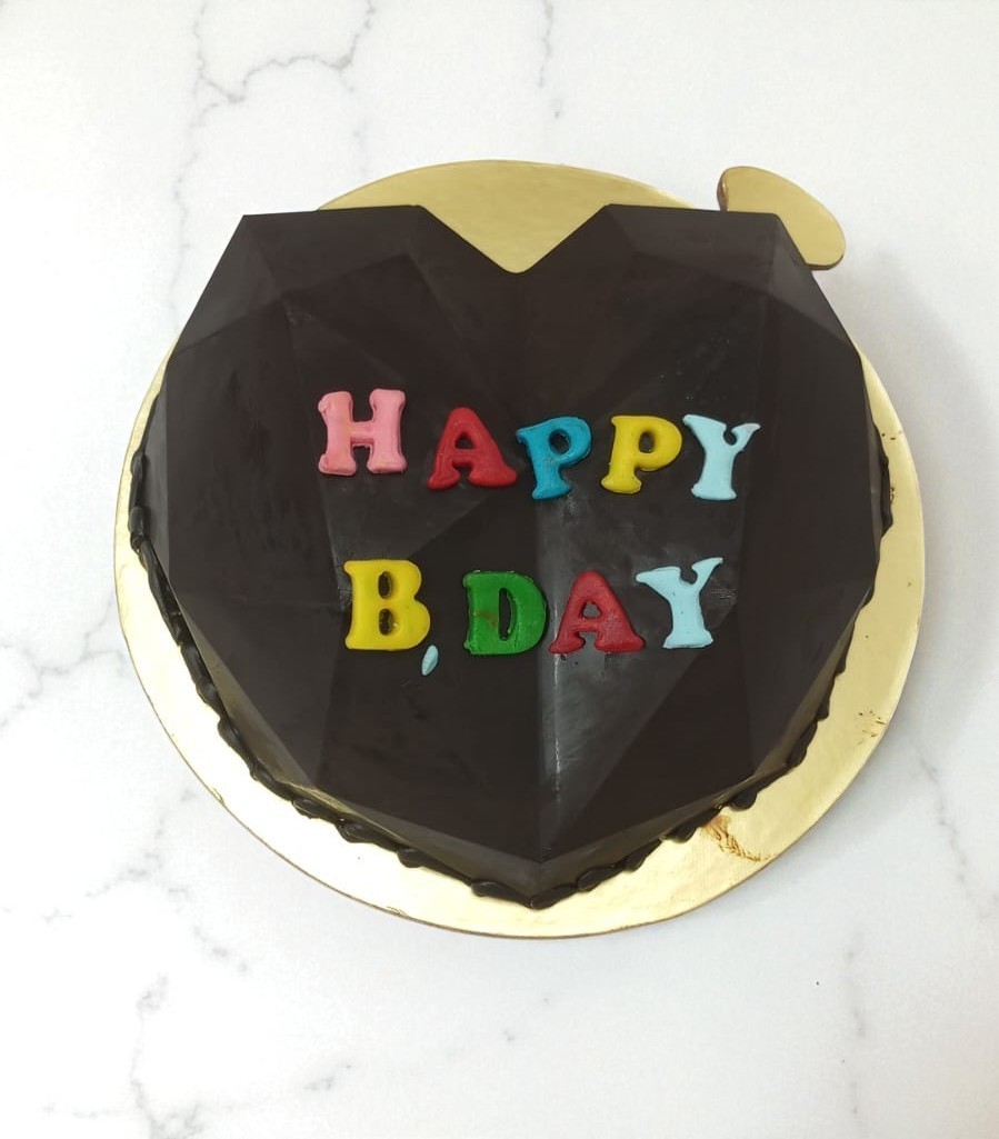 The diamond cut design of the heart made from hardened dark chocolate is decorated with edible Happy Birthday Fondant alphabets, Are you excited to know what's inside this heart shape chocolate Pinata, It's a design (piñata) pinata chocolate cake covered with diamond heart shaped dark chocolate. In 650 gms with wooden hammer.