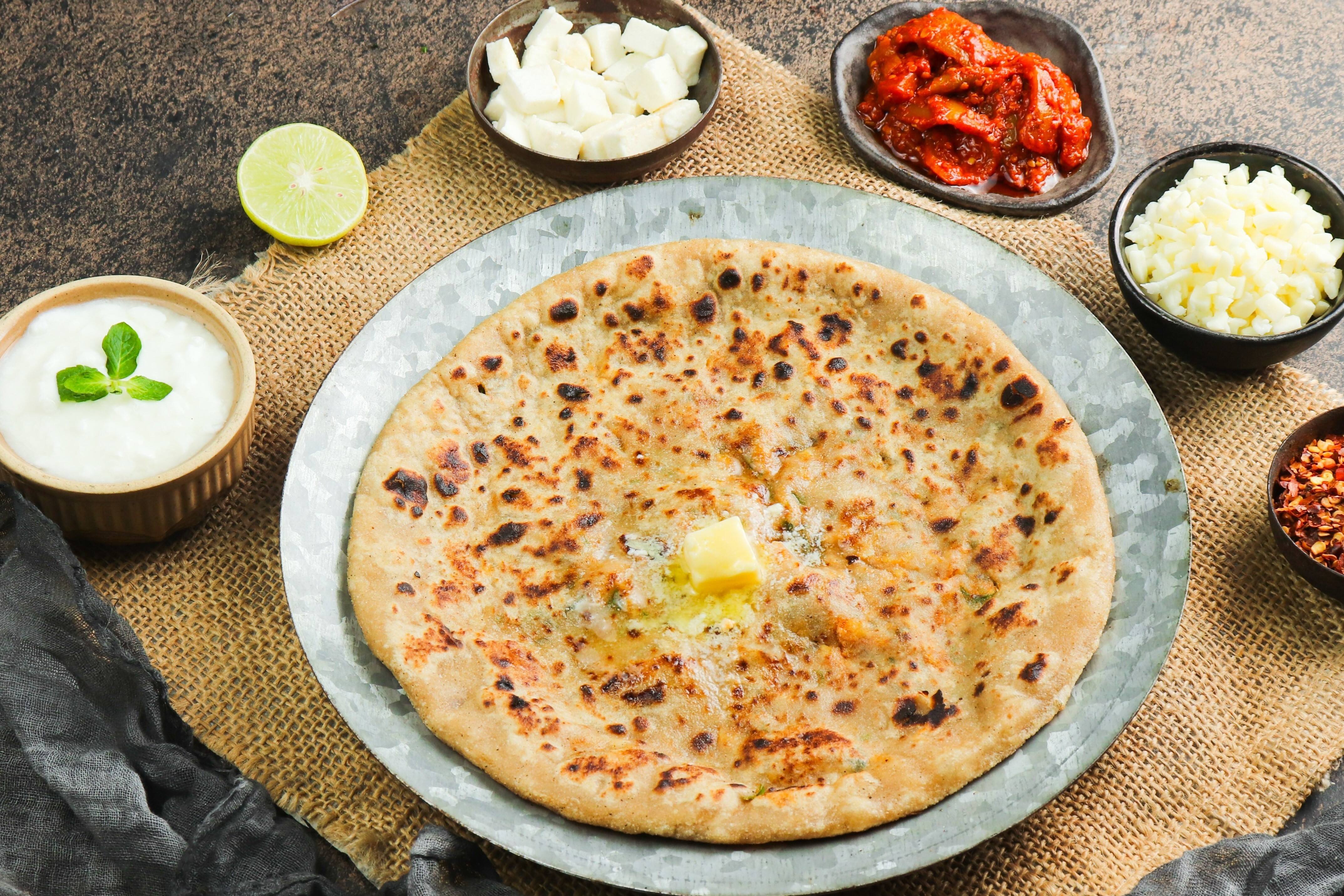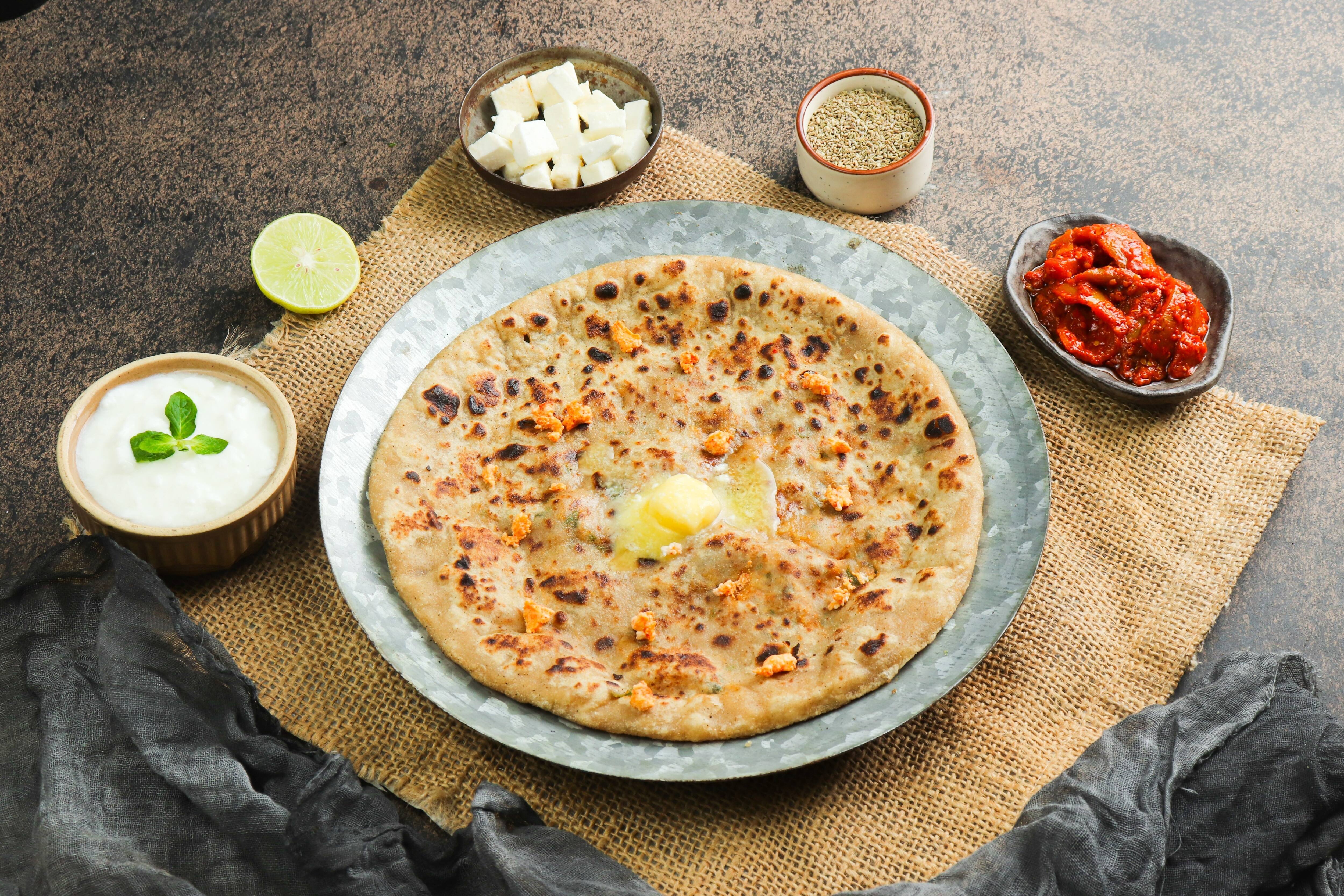 Boiled potato chunks in traditional tomato based light gravy topped with Indian spices served with 4 flaky pooris, pickle and salad.