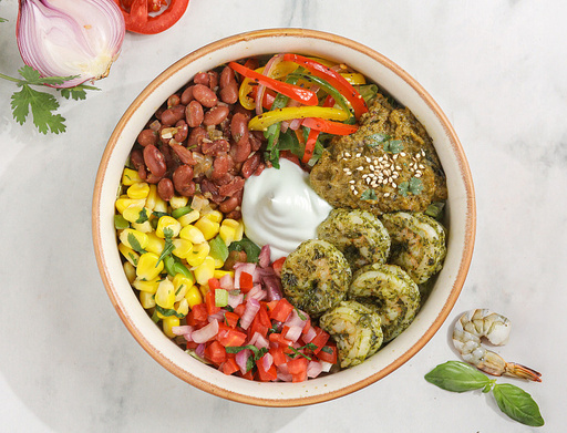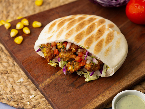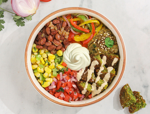 Crispy falafel paired with crunchy china and purple cabbage, tangy pickled veggies, and zesty tomato salsa. Layered with cool tzatziki, a fiery touch of hot sauce, served with herbed yogurt dip