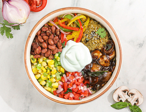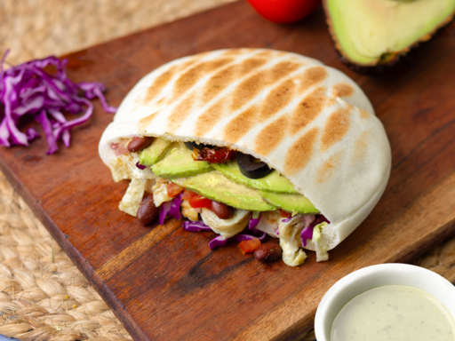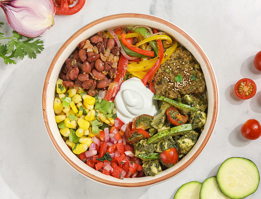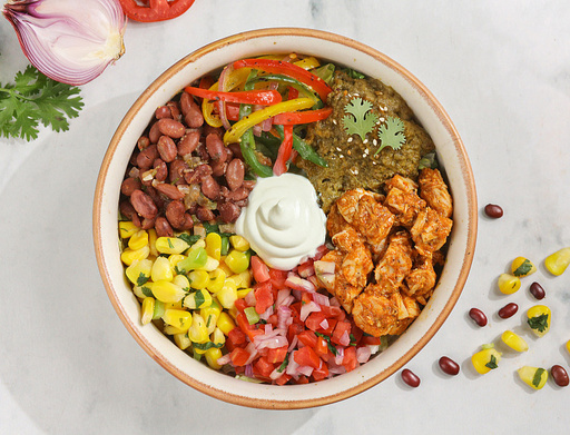 Tender shawarma-spiced chicken with china and purple cabbage, fresh tomato salsa, and a duo of sauces — cooling tzatziki, zesty herbed yogurt dressing, and a kick of hot sauce.