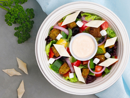 Village salad with salad greens, falafel, tomato, cucumber, sweet bell peppers, onion, olives, feta, baked pita crisps, house ranch dressing & bread