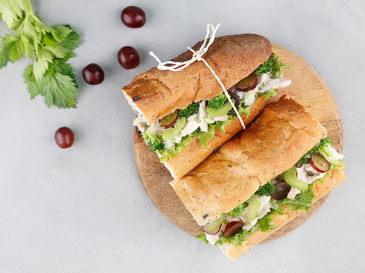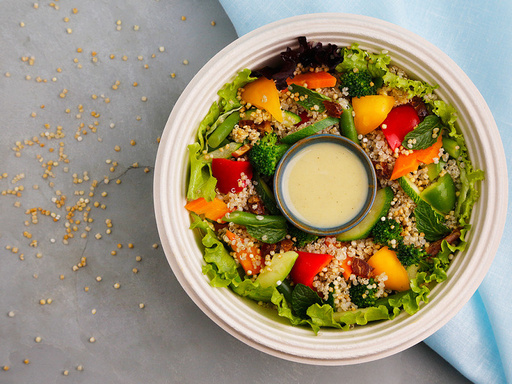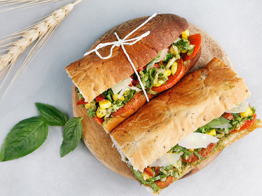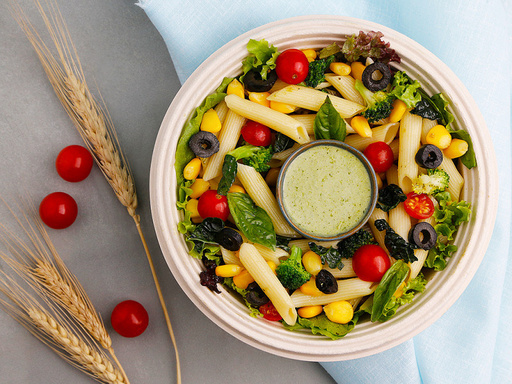 Whole-wheat pasta, assorted greens, sweet corn, broccoli, cherry tomatoes, black olives, sweet basil, yogurt-pesto dressing & bread