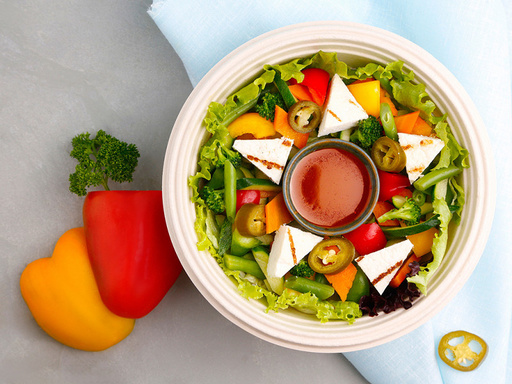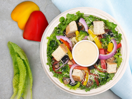 Signature salad of salad greens, sweet bell peppers, red onion, broccoli, mushrooms, sundried tomatoes, black olives, croutons, parmesan cheese, house Caesar dressing & bread.