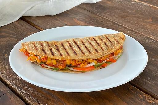 Treat yourself to our signature dish featuring peri peri chicken, expertly grilled to perfection and shredded, all wrapped in a flaky whole wheat paratha taco. This delightful creation is generously filled with freshly grilled vegetables, melted cheese, and a zesty, flavorful sauce, then grilled until it reaches a crisp, golden finish.