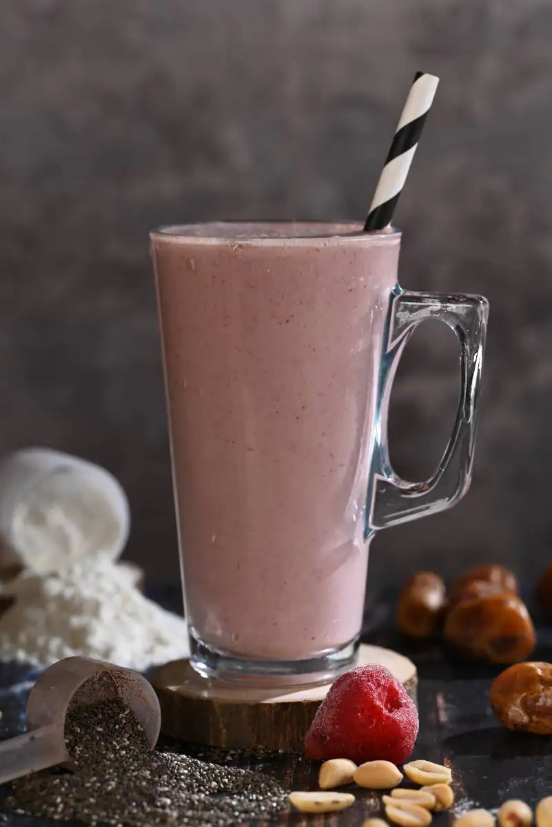Watermelon, strawberry, lime, honey and ice. High fibre, antioxidants, vitamin C, potassium and manganese.