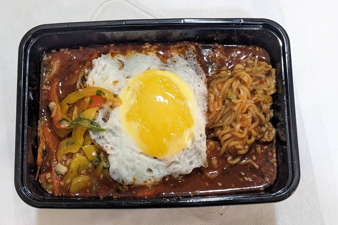 A bowl of spicy Korean noodles with a medley of fresh vegetables and a hint of sesame and chili.