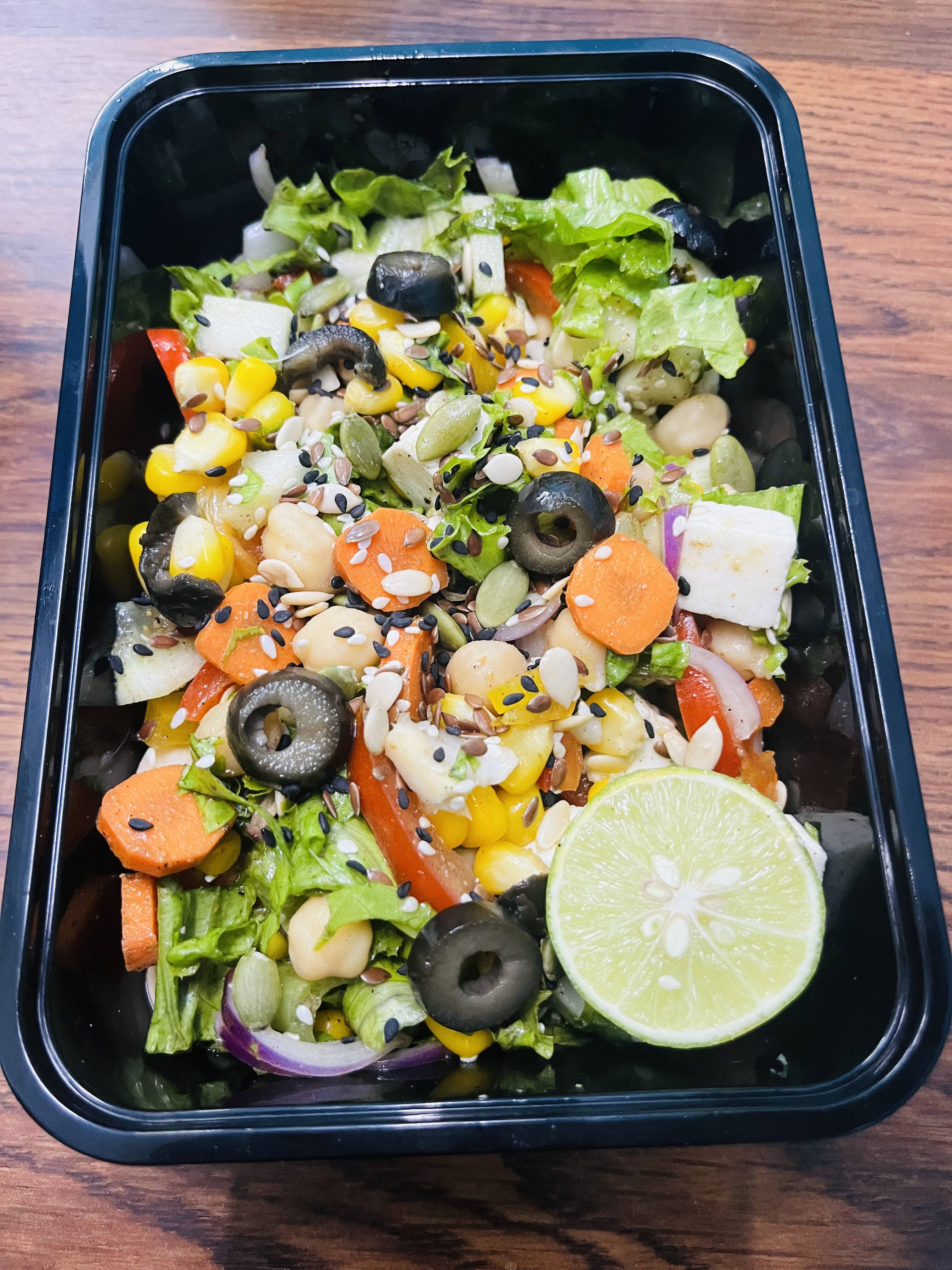 The meal is full of protein, contains crispy chickpeas, sweet corn, vegetables like broccoli, red cabbage, beans, capsicum which is high in micronutrients and is sautéed in light olive oil. [Calories: 285.588 kcal], [Protein: 17.34 grams], [Carbs: 43.22 grams], [Fat: 16.33 grams], [Fiber :6.12]