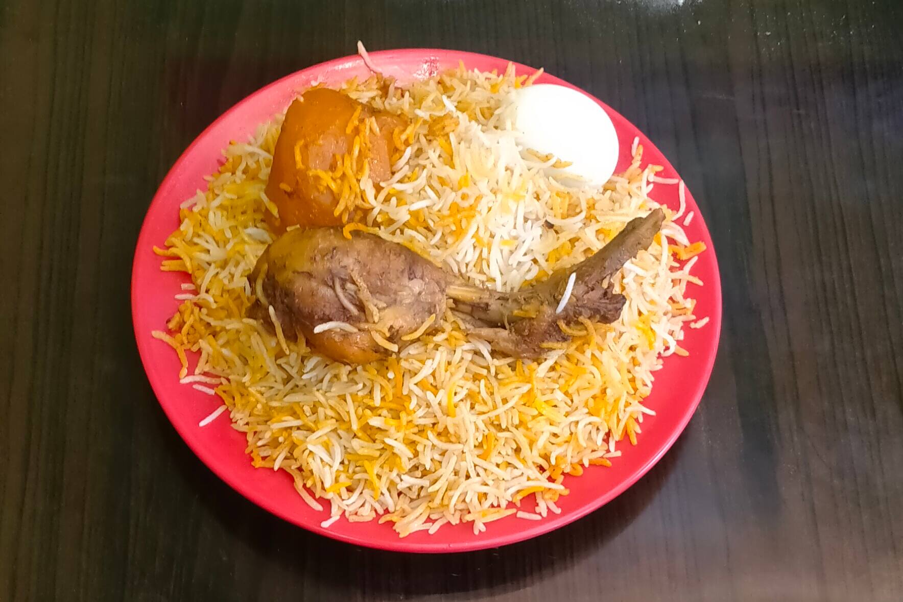 A rich and flavorful biryani made with tender pieces of chicken cooked in aromatic spices and served with a side of fluffy basmati rice and a flavorful aloo.