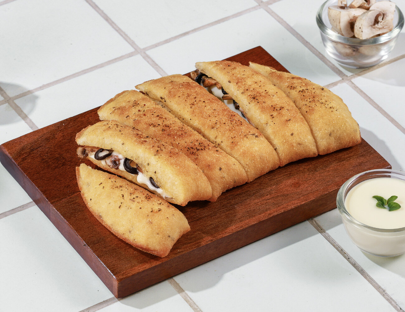 Garlic breadsticks stuffed with mushroom, olives & melting cheese. There ain't mush-room for anything else here. ;)