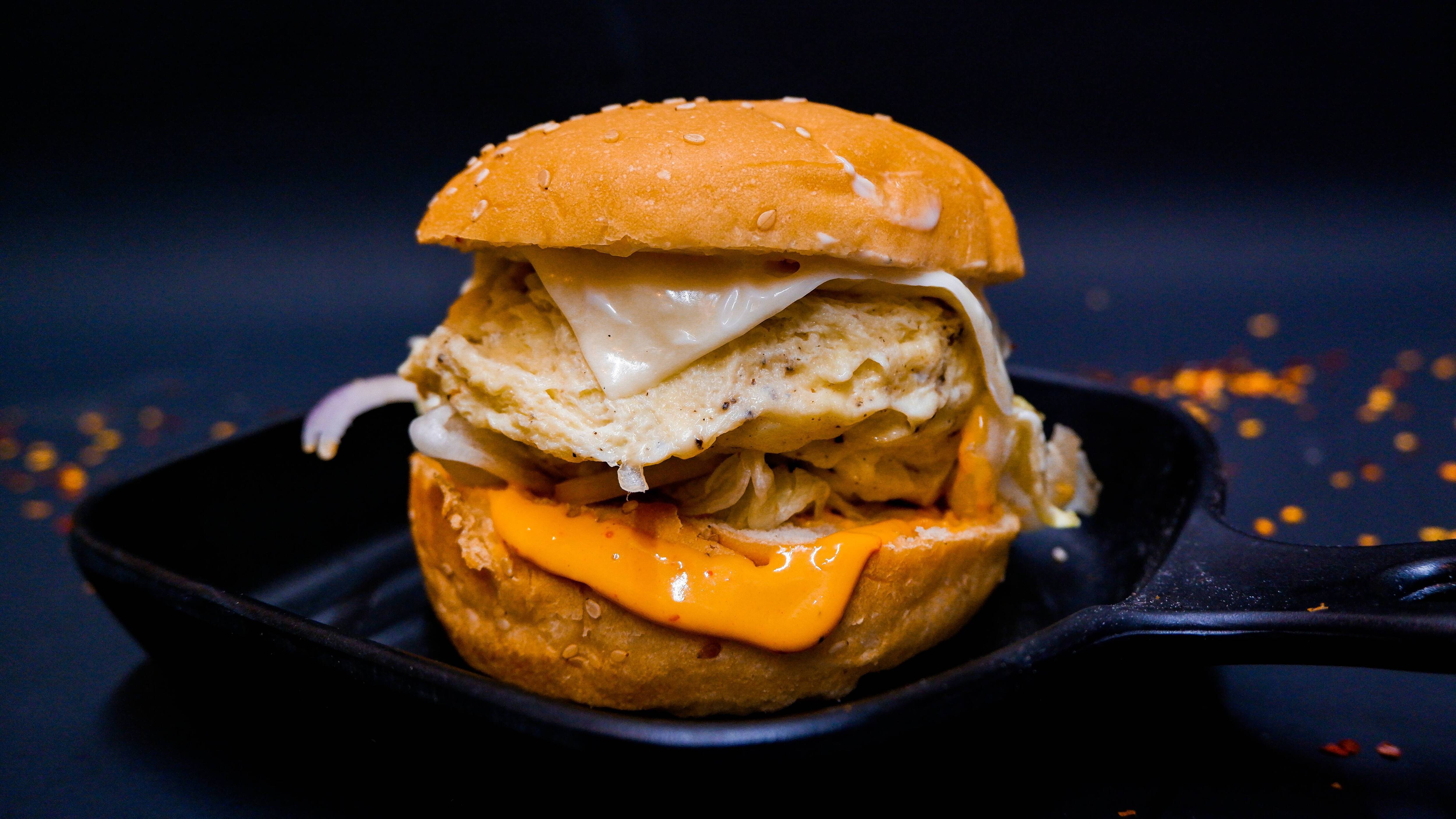 Veg double patty fried nd topped and piled onto soft rolls of buns with onion, lettuce,veggies.