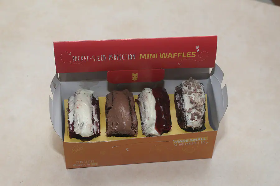 | 1 pc |each serving is a freshly baked red velvet waffle-wich with white chocolate filling and cream cheese spread, topped with icing sugar sprinkle.