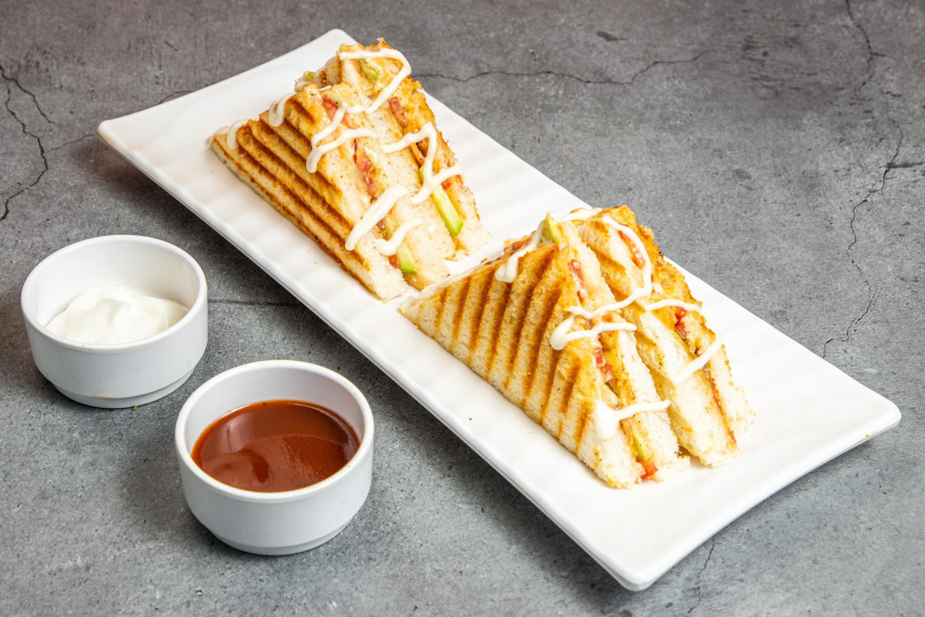 Melt into the deliciousness of our veg cheese grilled sandwich, featuring melted cheese, fresh veggies, and fragrant herbs and spices for a mouthwatering meal.