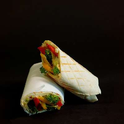 This wrap is a flavorful combination of olive oil sauted bell peppers, olives, broccoli and tomato mixed with secret sauces and mayo that is layered on lettuce and packed in soft tortilla wrap and served grilled.