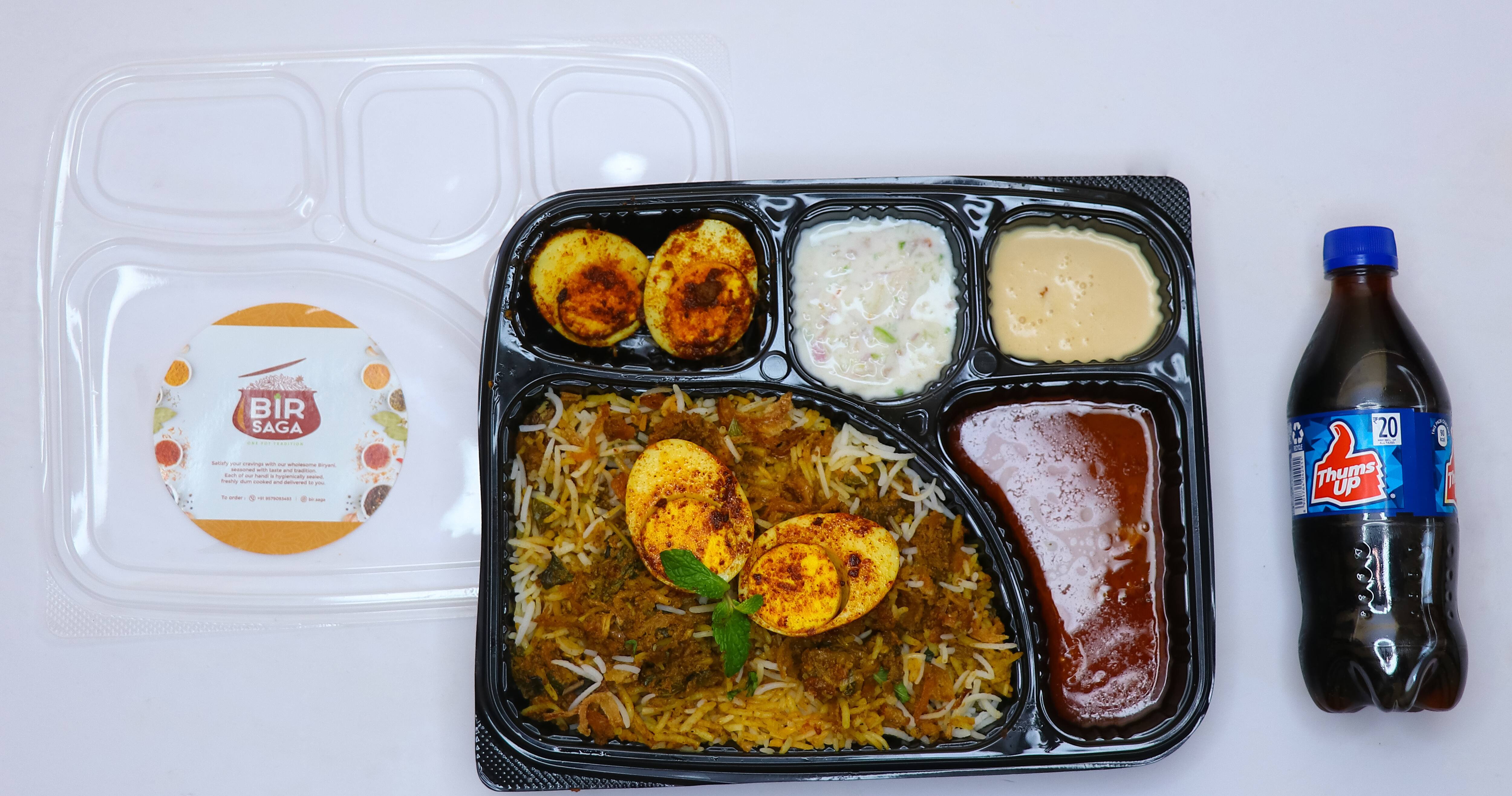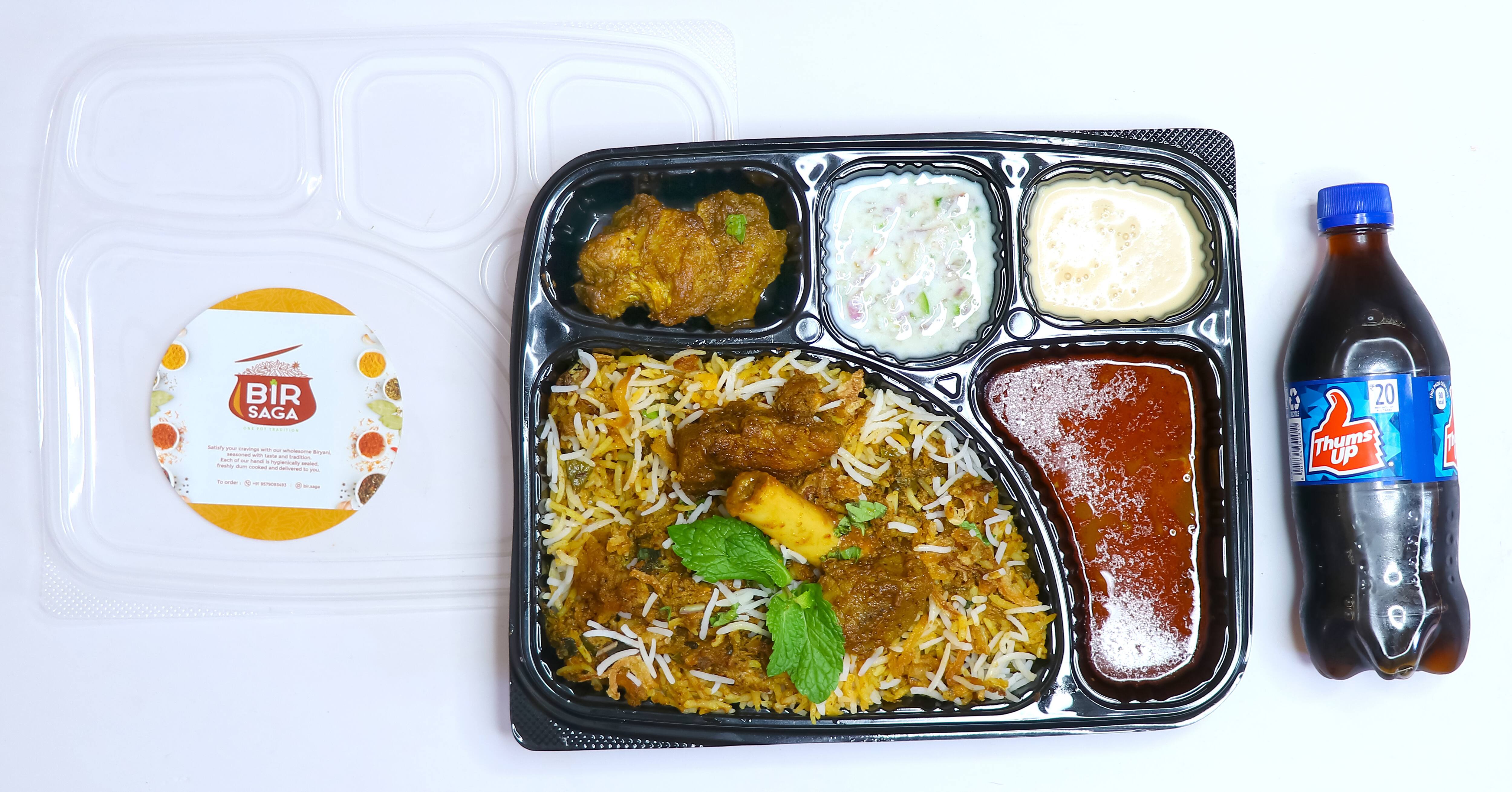 Biryani will be served in a Meal Box not in a Handi. Meal Box will include - Murg Dum Biryani, Raita, Rassa, Gulab Jamun, Chicken ghee roast (2 pieces)