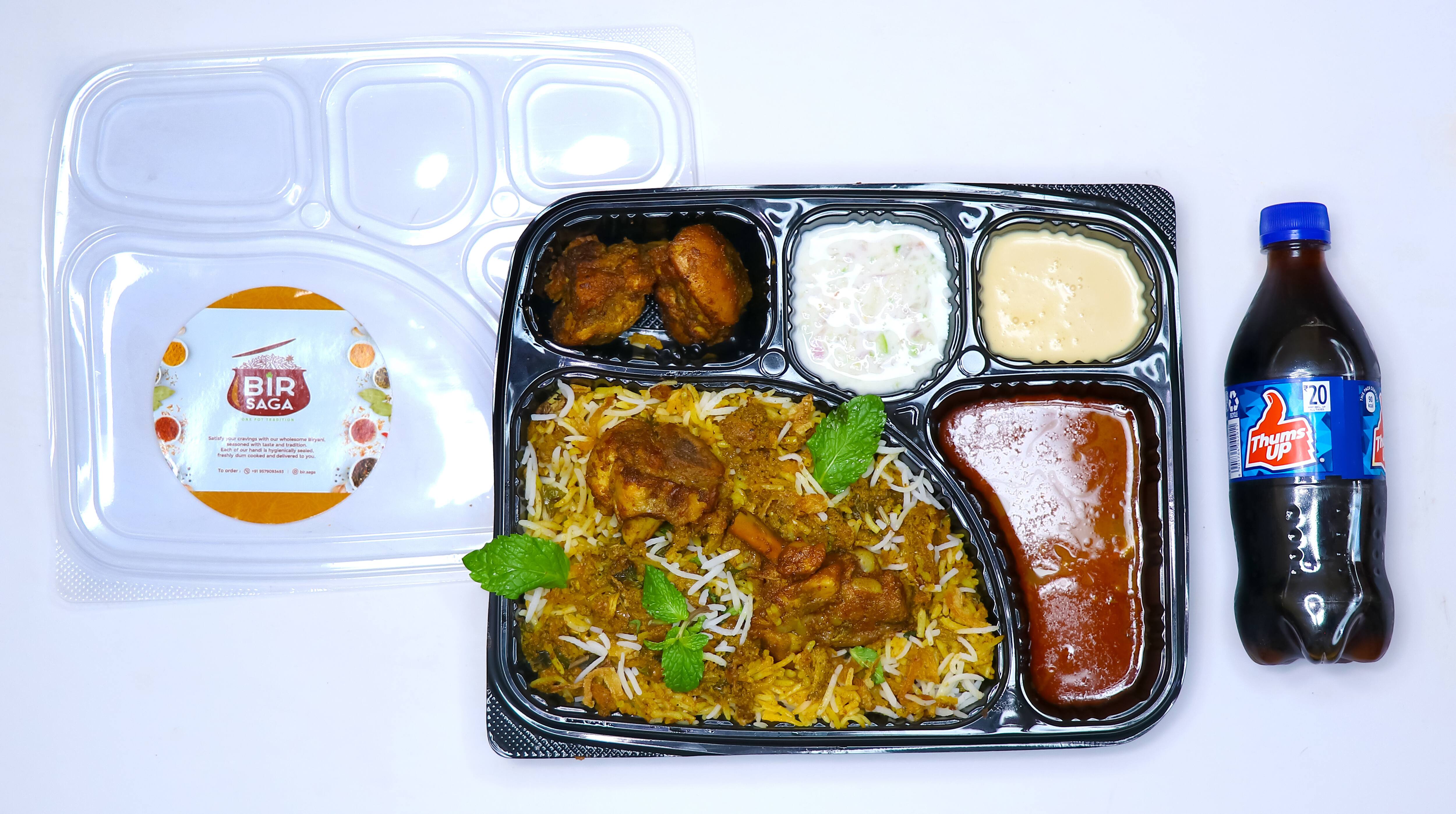 Biryani will be served in a Meal Box not in a Handi. Meal Box will include ghost dum biryani, raita, rassa, gulab jamun, mutton ghee roast [2 Pieces]