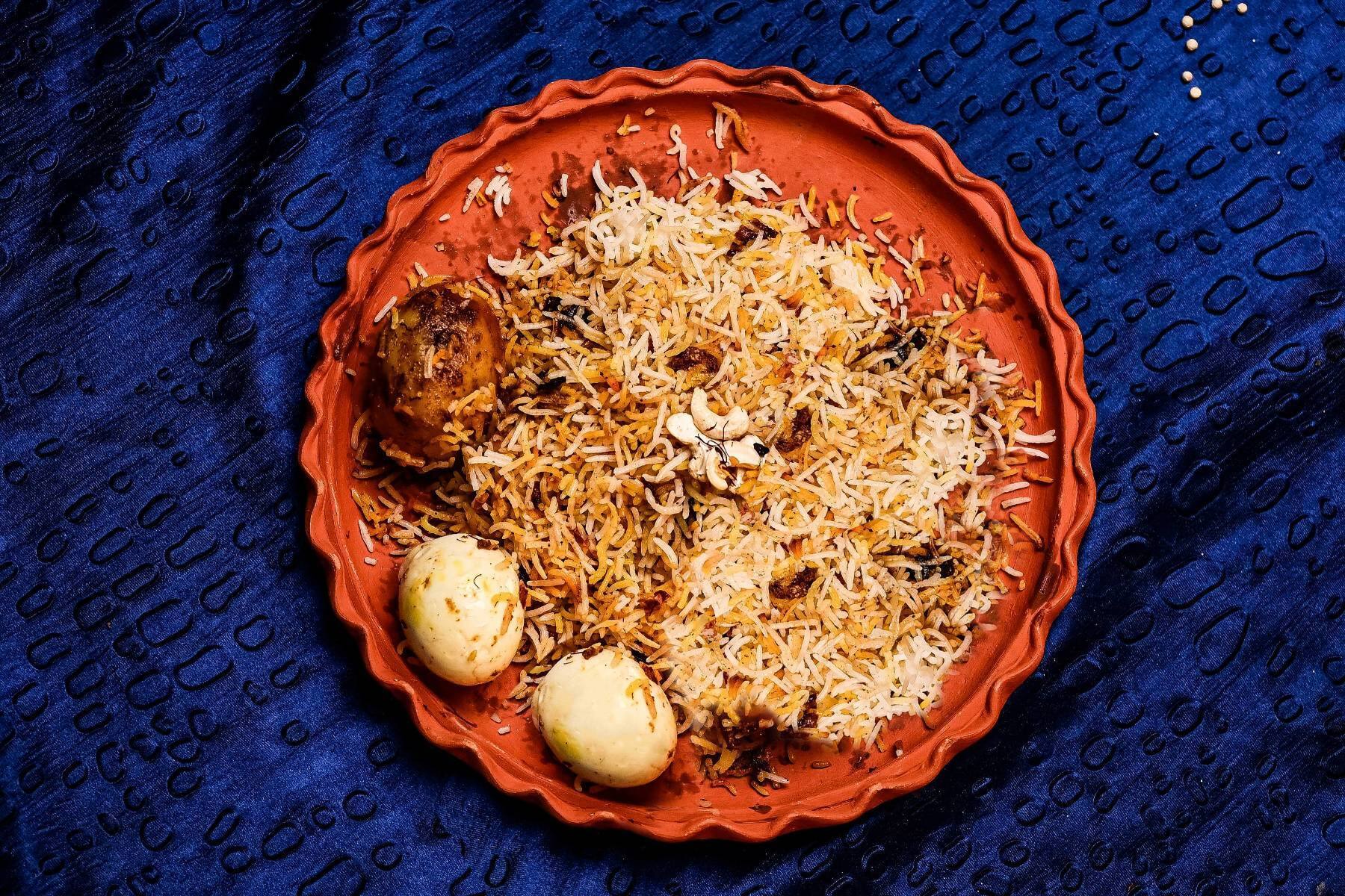 Dum pukht method of cooking rice with mutton piece, aloo and egg imparting a typical Kolkata biryani flavour. Riyazi Mutton [1 piece, 200 grams], aloo [1 piece], 1 egg and rice [1.5 litre].